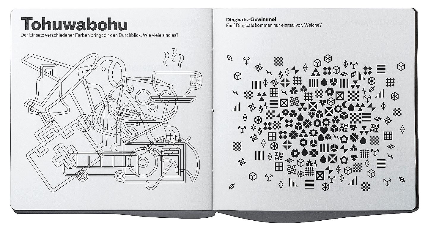 Hinter dem Begriff FF Dingbats verbirgt sich eine digitale Sammlung von schmückenden Zeichen und Symbolen. Johannes Erler hat sie 1993 entwickelt und 2008 überarbeitet und ergänzt. Um die Einführung der neuen Version zu unterstützen, realisierten Johannes und Isabelle Erler zusammen mit Jan Filek und dem FontShop das Dingbats-Spieleheft.