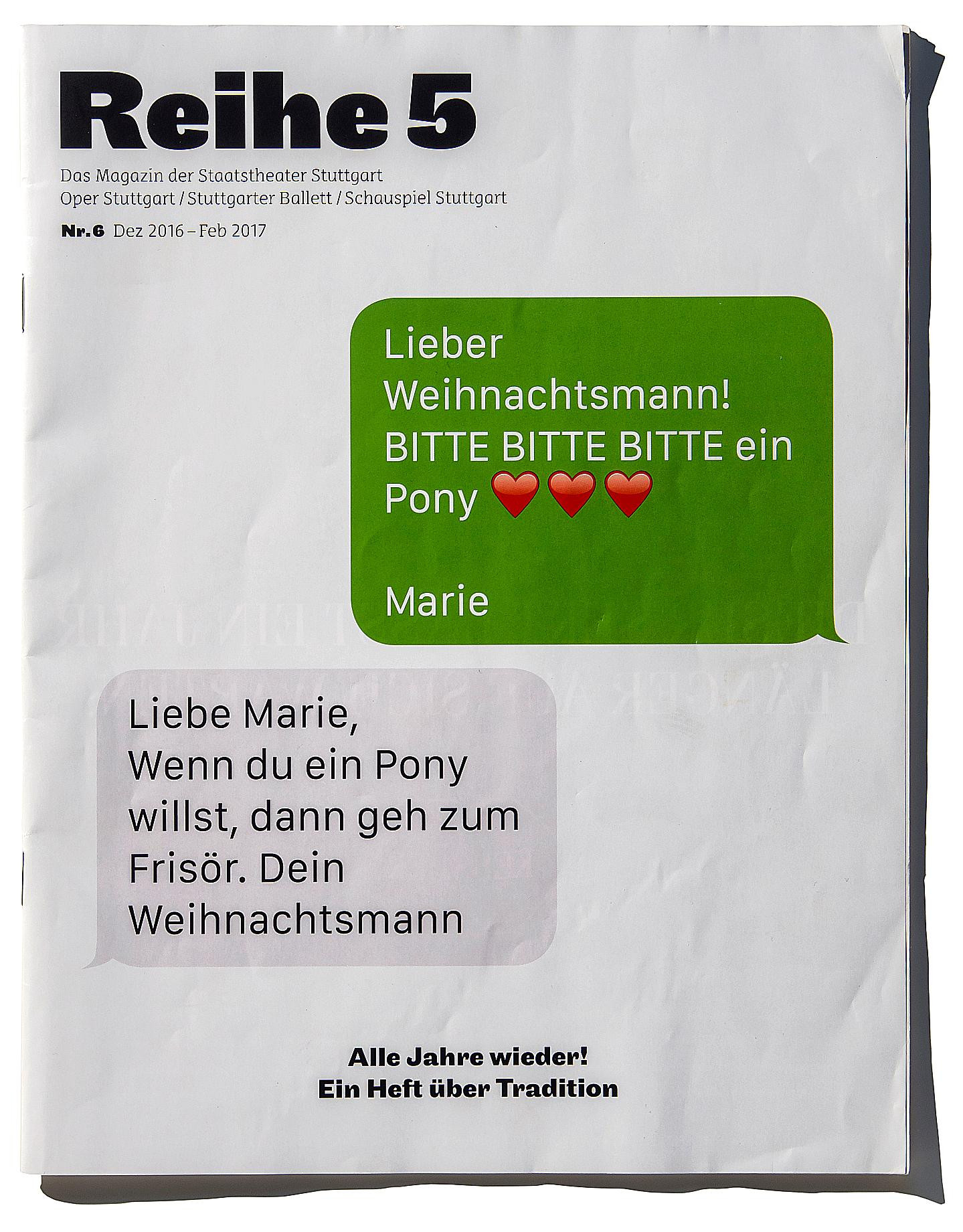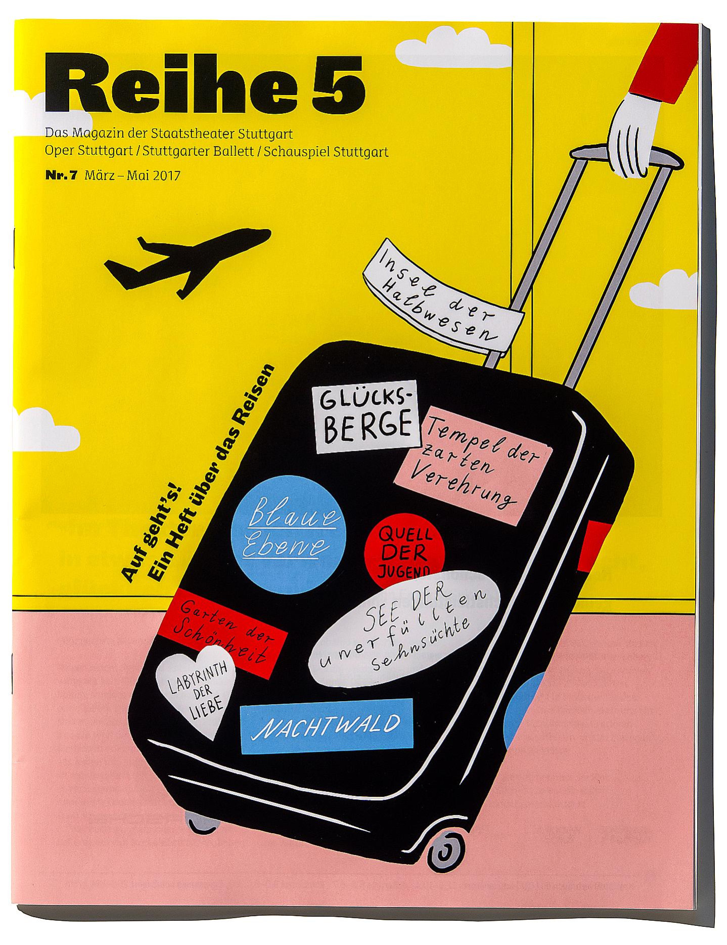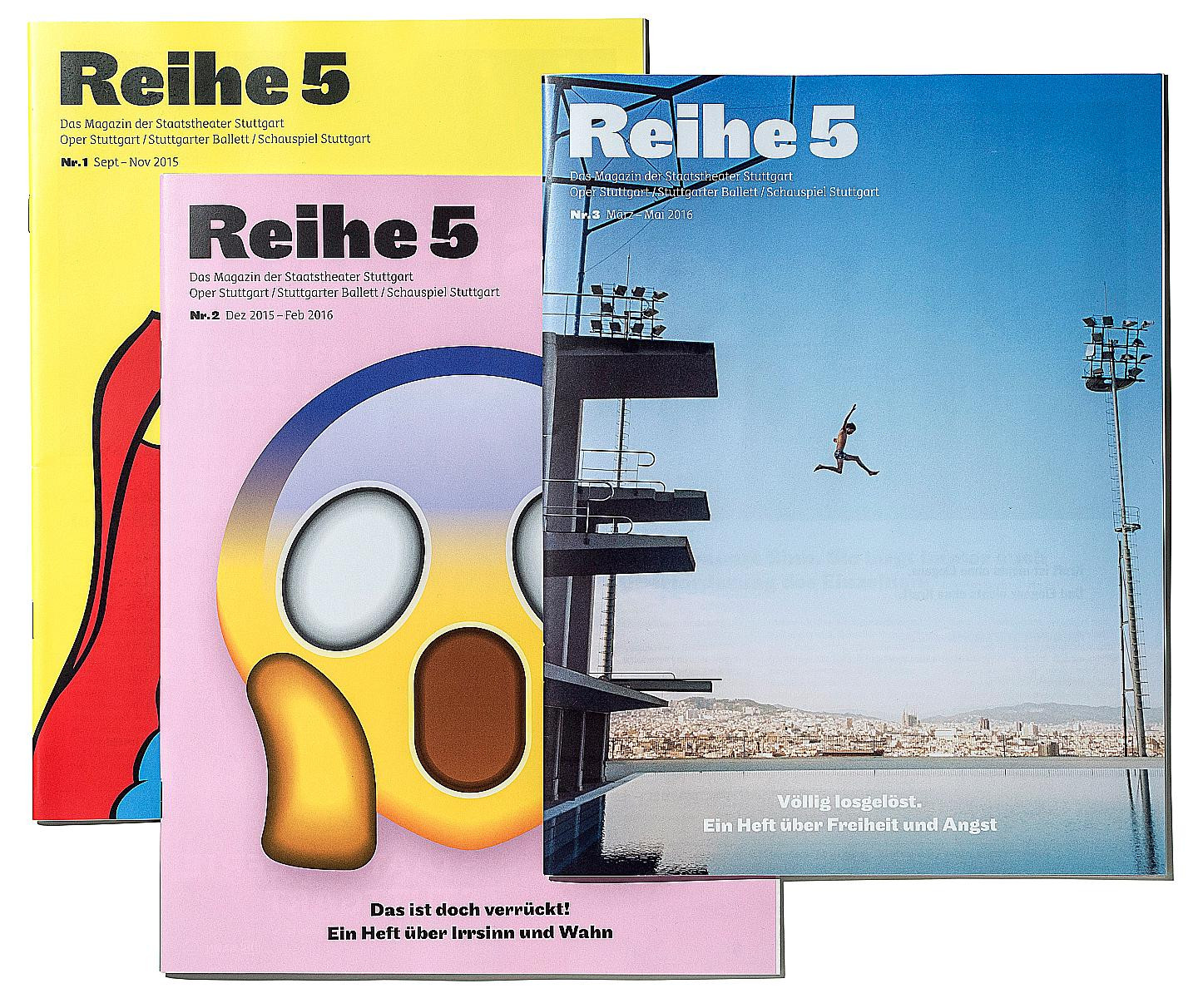 Reihe 5 ist das viermal jährlich erscheinende Magazin der Staatstheater Stuttgart. Neben immer wieder neuen Schwerpunktthemen wie ›Helden‹, ›Verführung‹ oder ›Grenzüberschreitung‹ enthält jede Ausgabe auch eine Doppelseite für Kinder zwischen acht und zwölf Jahren mit unterhaltenden und informativen Texten rund um die großen und kleinen Menschen hinter den Kulissen und auf der Bühne von Oper, Ballett und Schauspiel.